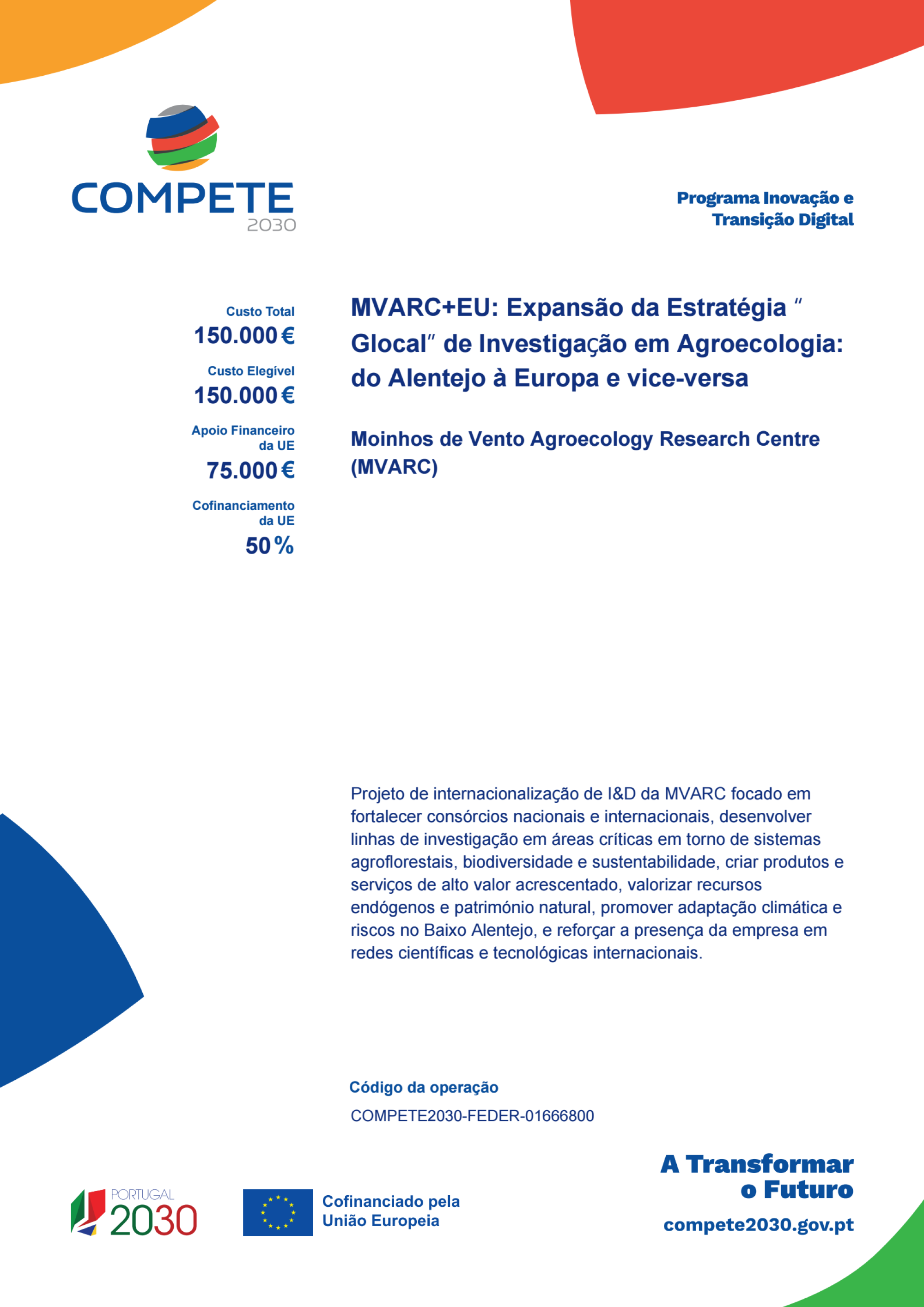 O MVARC+EU é um projeto de internacionalização de I&D focado em fortalecer consórcios nacionais e internacionais, desenvolver linhas de investigação em áreas críticas em torno de sistemas agroflorestais, biodiversidade e sustentabilidade, criar produtos e serviços de alto valor acrescentado, valorizar recursos endógenos e património natural, promover adaptação climática e riscos no Baixo Alentejo, e reforçar a presença da empresa em redes científicas e tecnológicas internacionais.